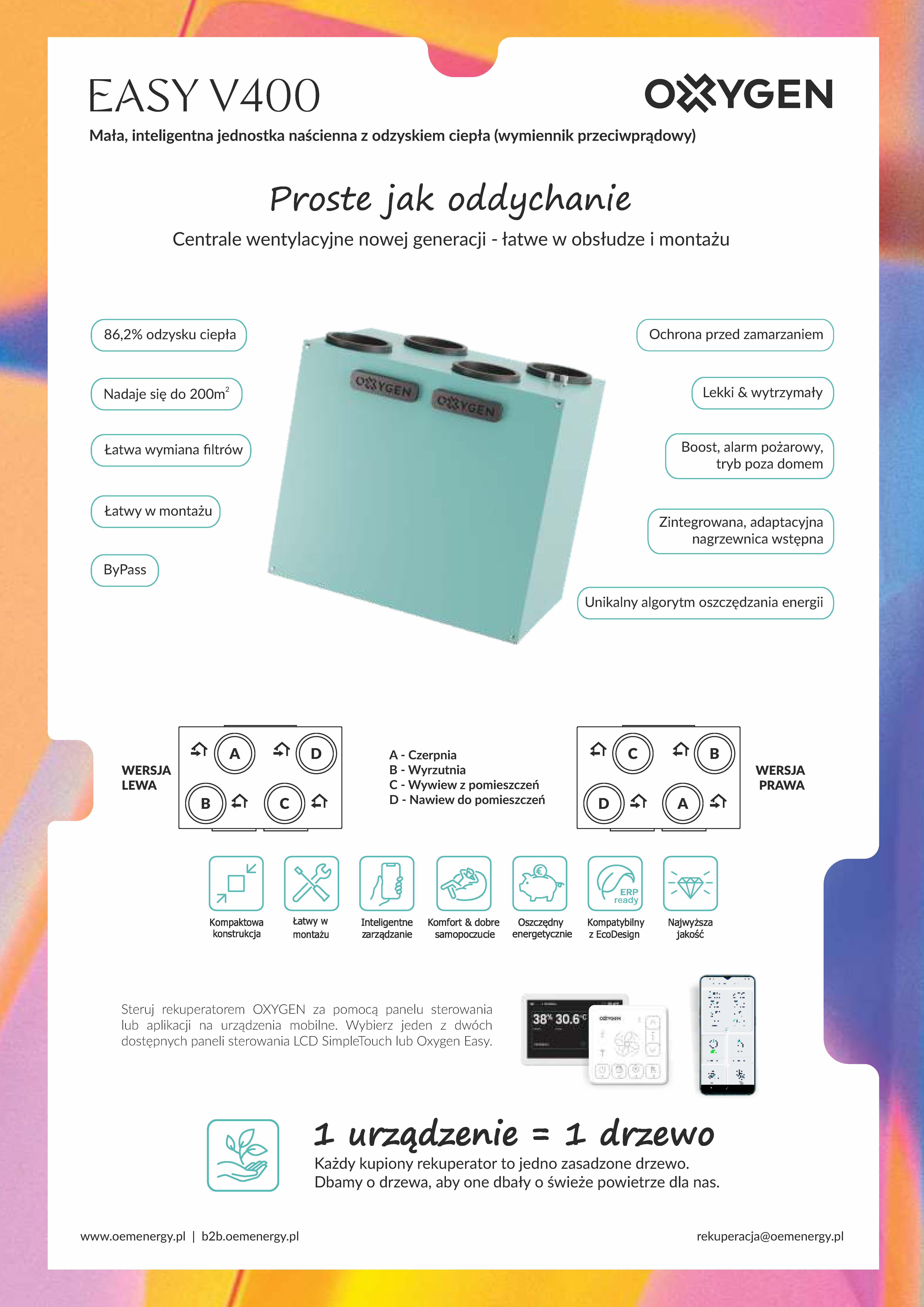 - prosty intuicyjny panel sterowania LCD lub aplikacja umożliwiająca sterowanie rekuperatorami Oxygen za pomocą smaftfona